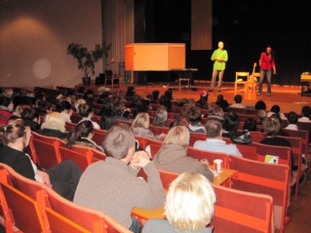 Miljöshow på Wenströmska Dagens höjdpunkt var förställningen ”Utomhus & Inombords" som spelades av musikerna och showartisterna Cecilia Bergqvist och Bengt Erlandsson. Det är en fundig, musikalisk och tänkbar föreställning om hur vi tar oss an klimatfrågan från tv-soffan. Den framfördes med en ypperlig blandning av komik och allvar, anser Charlotte Bäckström projektledare för Coola Kålroten. Dagsaktuella ämnenDagen gav information och diskussioner om dagsaktuella frågor som klimatförändringarna, kemikalier, djurhänsyn och ekonomi. - Vi vill inte spä på ungdomars klimatångest och frustration utan istället ge konkreta tips på hur vi alla kan bidra genom ”S.M.A.R.T.-a” val i vardagen, påpekar Charlotte Bäckström. Charlotte Bäckström 2009-12-08 |